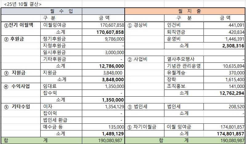 유월계승(연대사업비) 37만 원, 이한열 소셜펠로우십 지원금 등 장학사업비 162만 원, 조직홍보비 14만 원 지출했