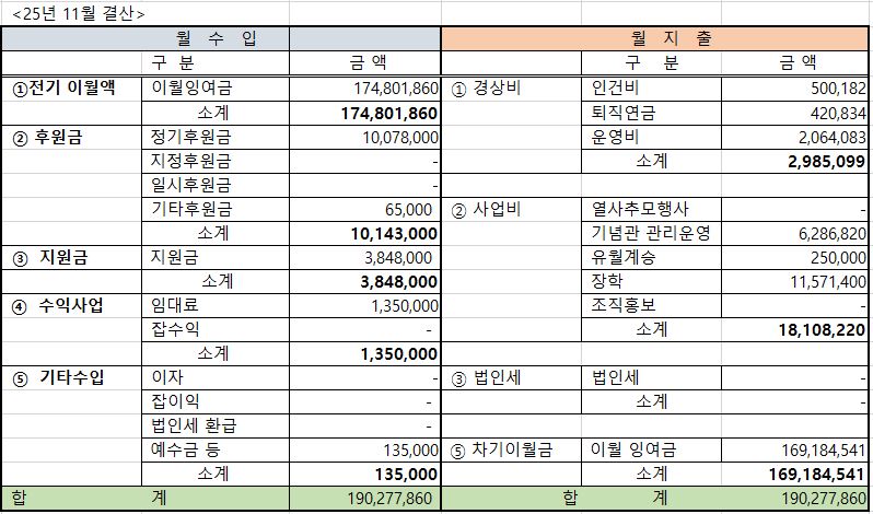 - 일반관리비, 인건비 등으로 629만 원의 기념관 관리운영비 지출했습니다. 유월계승(연대사업비) 25만 원, 김복영 장학금 1,000만 원,