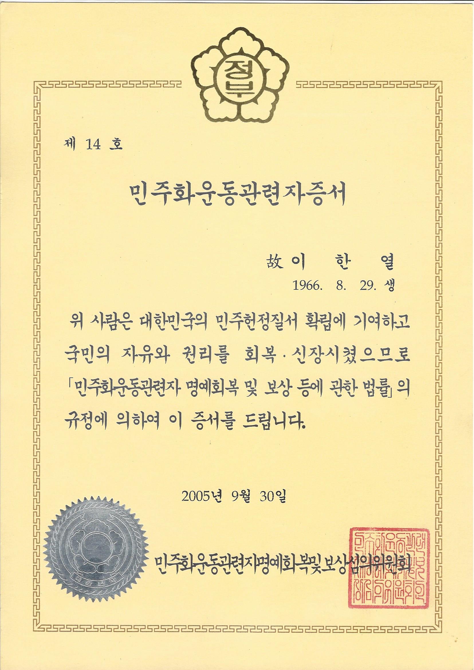 이한열은 현재 민주화운동관련자일뿐입니다. 이것도 김대중 정부가 들어선 후 전국민족민주유가족협의회*가 (이하 유가협) 422일간 국회 앞에서 천막농성을 해서 겨우 얻어낸 것입니다.** 그때 유가협 어른들은 대통령이 바뀐다고 저절로 되는 것은 없다, 요구해야만 작은 것이라도 얻을 수 있다는 것을 배웠다고 하십니다. 2000년 1월 공포된 민주화운동명예회복법에 의해 이한열은 2005년 ‘민주화운동관련자증서’를 받았습니다.