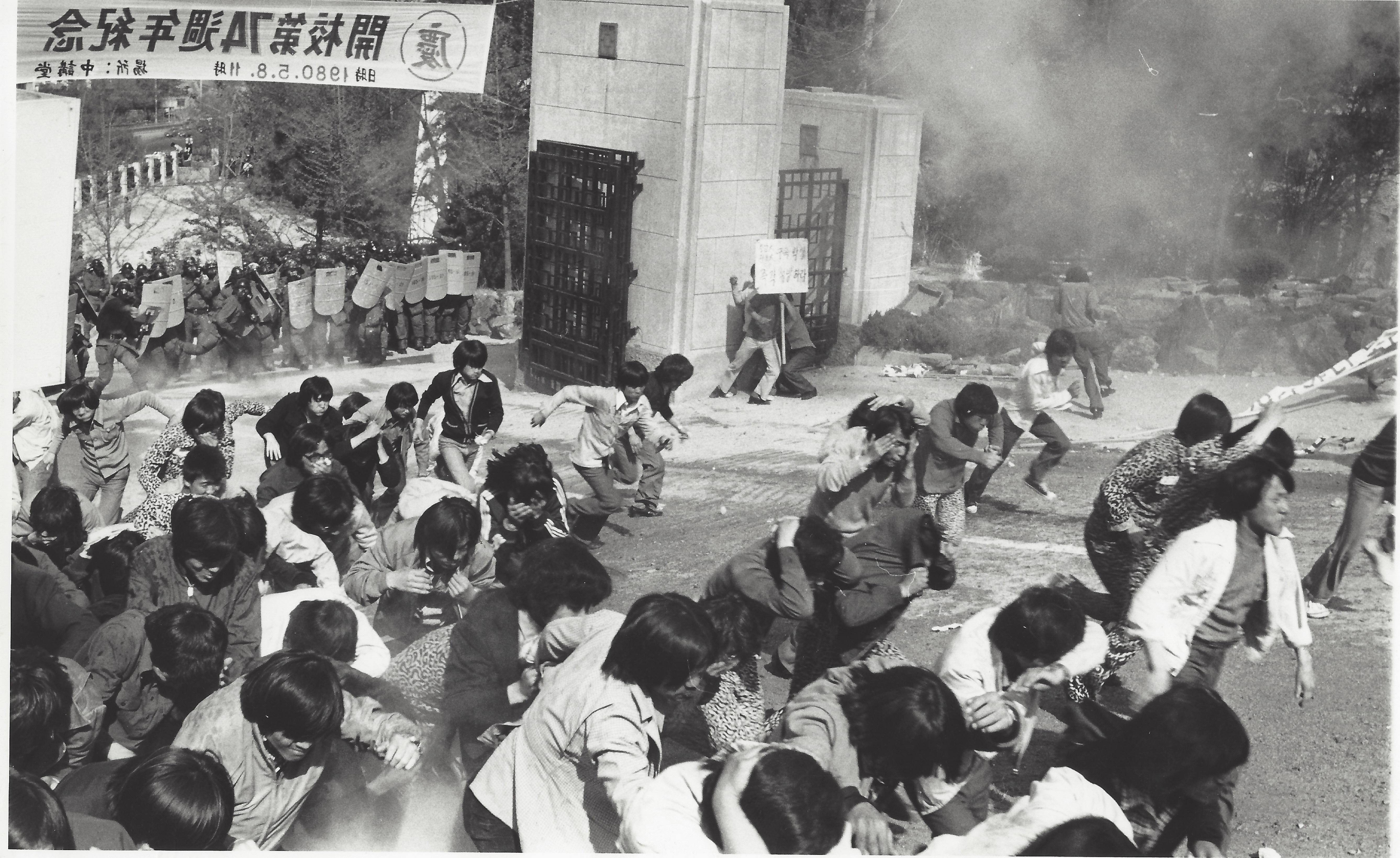교문 바로 앞까지 밀고 들어온 전투경찰들을 피해 학생들이 최루탄을 맡으며 교문 안으로 들어오고 있다. 교문에는 ‘개교 74주년 기념 시간 : 5월 8일 11시, 장소 : 중강당’ 플랭카드가 걸려 있다.