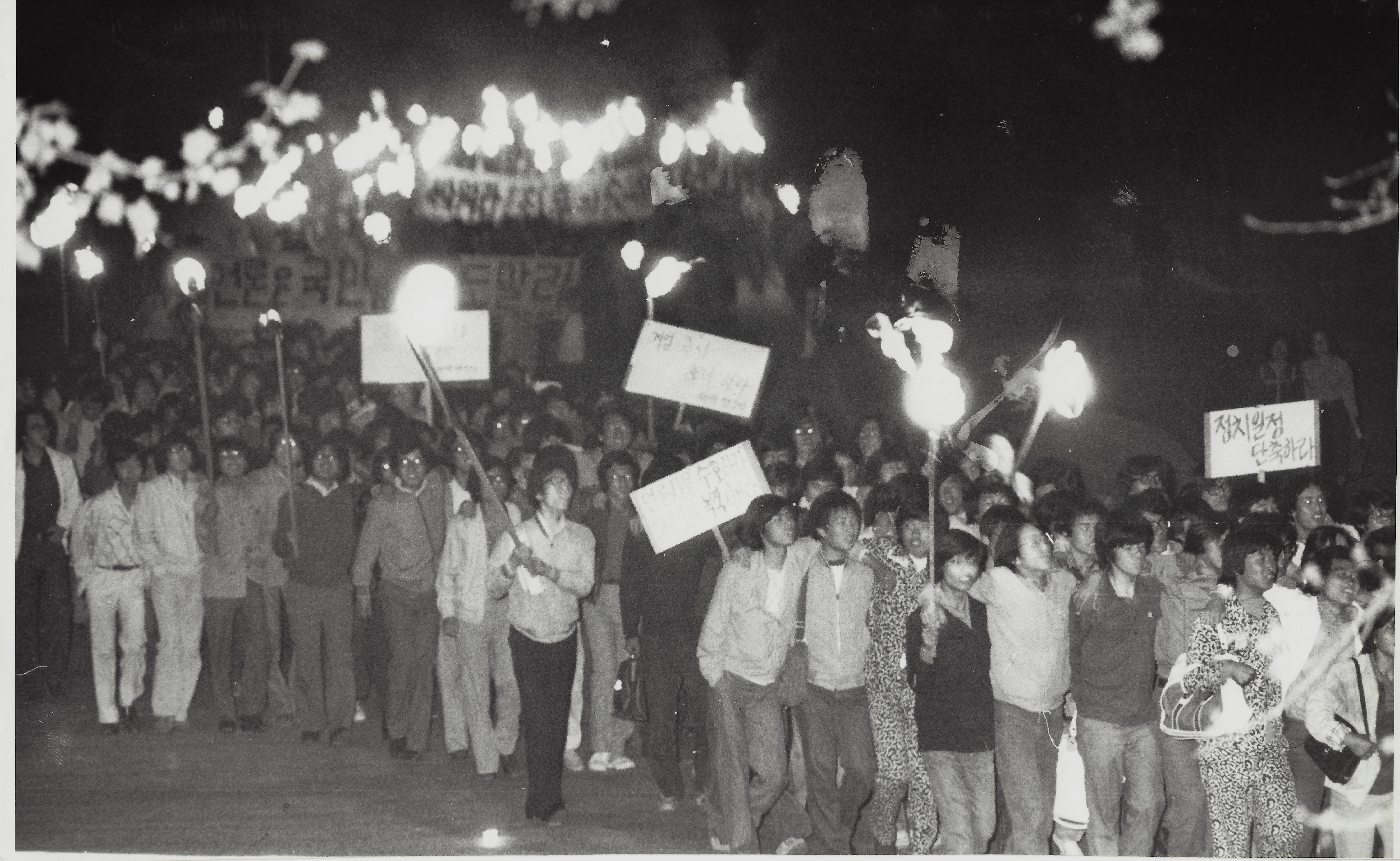 낮에 이어 밤까지 횃불을 들고 스크럼을 짜고 시위하는 고려대 학생들의 모습으로 “계엄령을 해체하라”, “언론자유 수호하라”, “정치일정 단축하라” 등의 피켓을 들고 행진하고 있다.