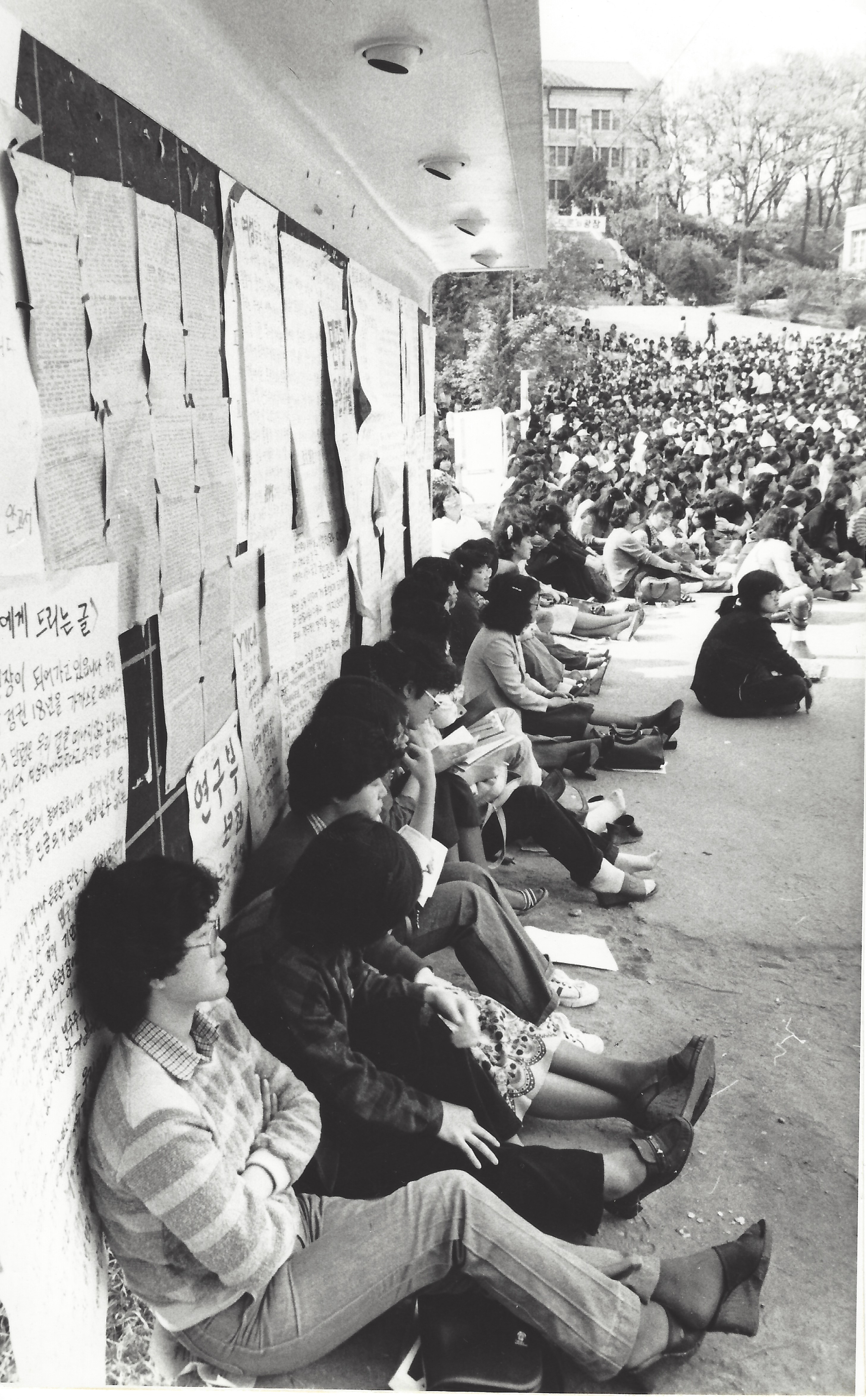 학내 언론까지 검열이 한창이었던 당시엔 자유로운 의사표시는 대자보와 현수막 등을 통해서였다. 집회에 참석한 이화여대 학생들이 ‘학우들에게 드리는 글’ 등의 대자보가 빼곡히 붙은 게시판 앞에 앉아있다. 당시 유행하던 것으로 보이는 통굽의 구두를 신고 있는 여학생들도 보인다.