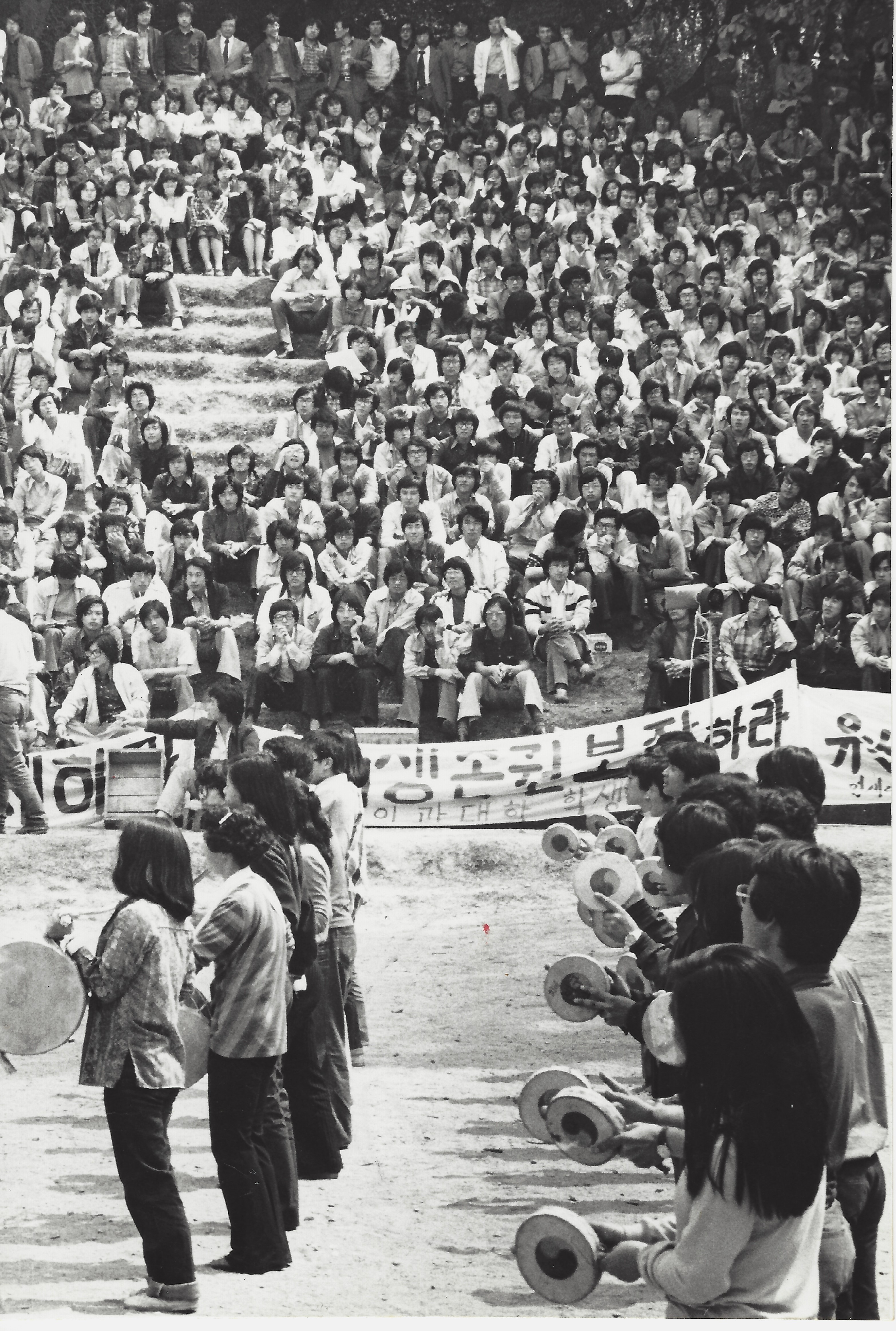 1980년대 대학가에서는 풍물패, 탈패 등 문예 동아리의 활동이 활발했고 전통문화를 되살리는 데 대한 학생들의 관심도 높았다. 따라서 시위나 집회 현장에서 풍물이 등장하는 모습을 쉽게 찾아볼 수 있었다. 집회 중인 연세대 노천극장 중앙에 북을 들고 있는 학생들과 소고를 치고 있는 학생들이 보인다.