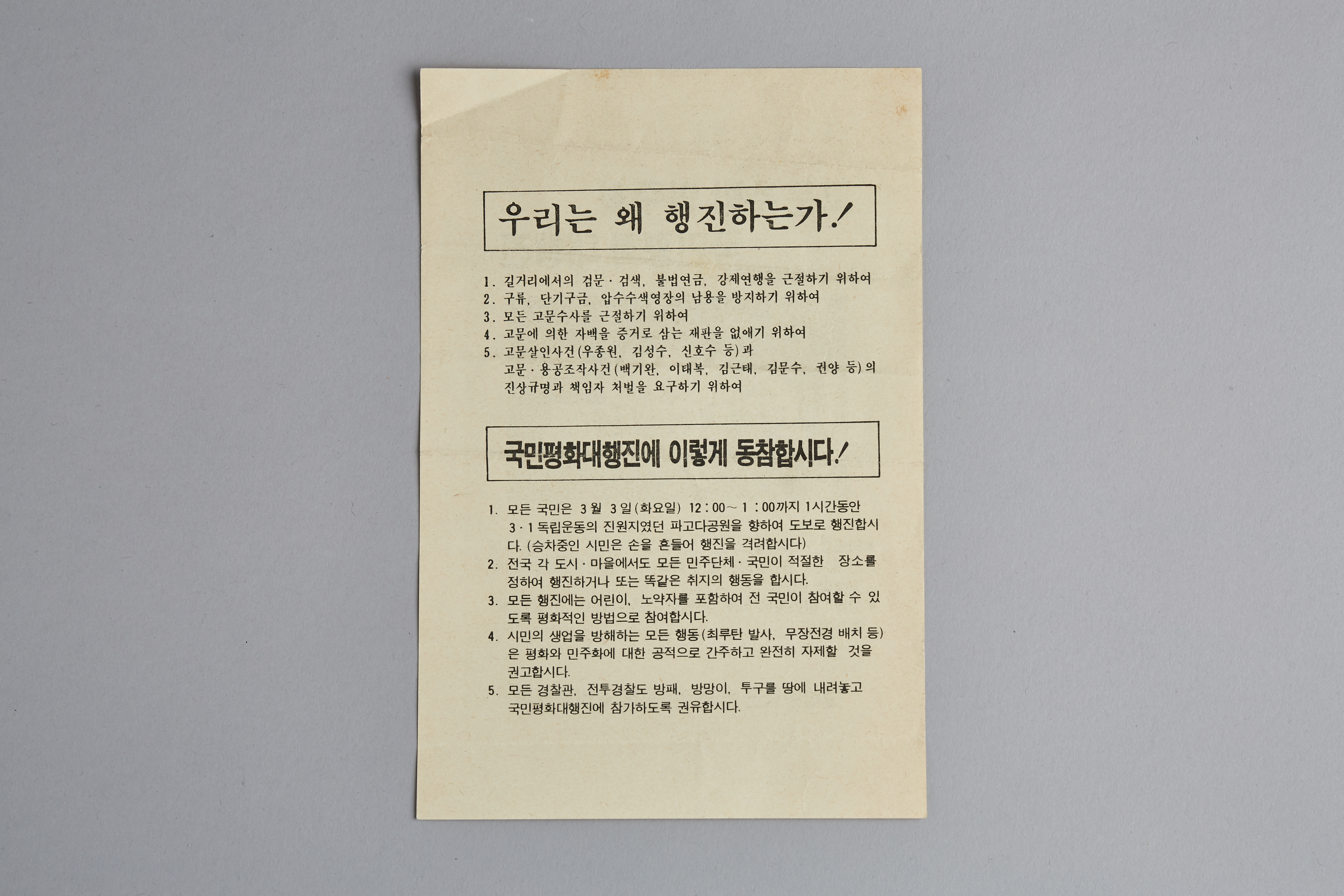 1987년 3월 3일(박종철의 49재)에 열릴 '고문추방 민주화국민평화대행진' 전단지이다. 평화대행진은 박종철 등 고문희생자들에 대한 추모와 불법연금, 강제연행, 고문용공조작 사건의 진상규명과 책임자 처벌요구 등에 있다고 밝혔지만 경찰은 행사 장소들을 봉쇄하고 폭력적으로 해산작전을 펼쳤다.