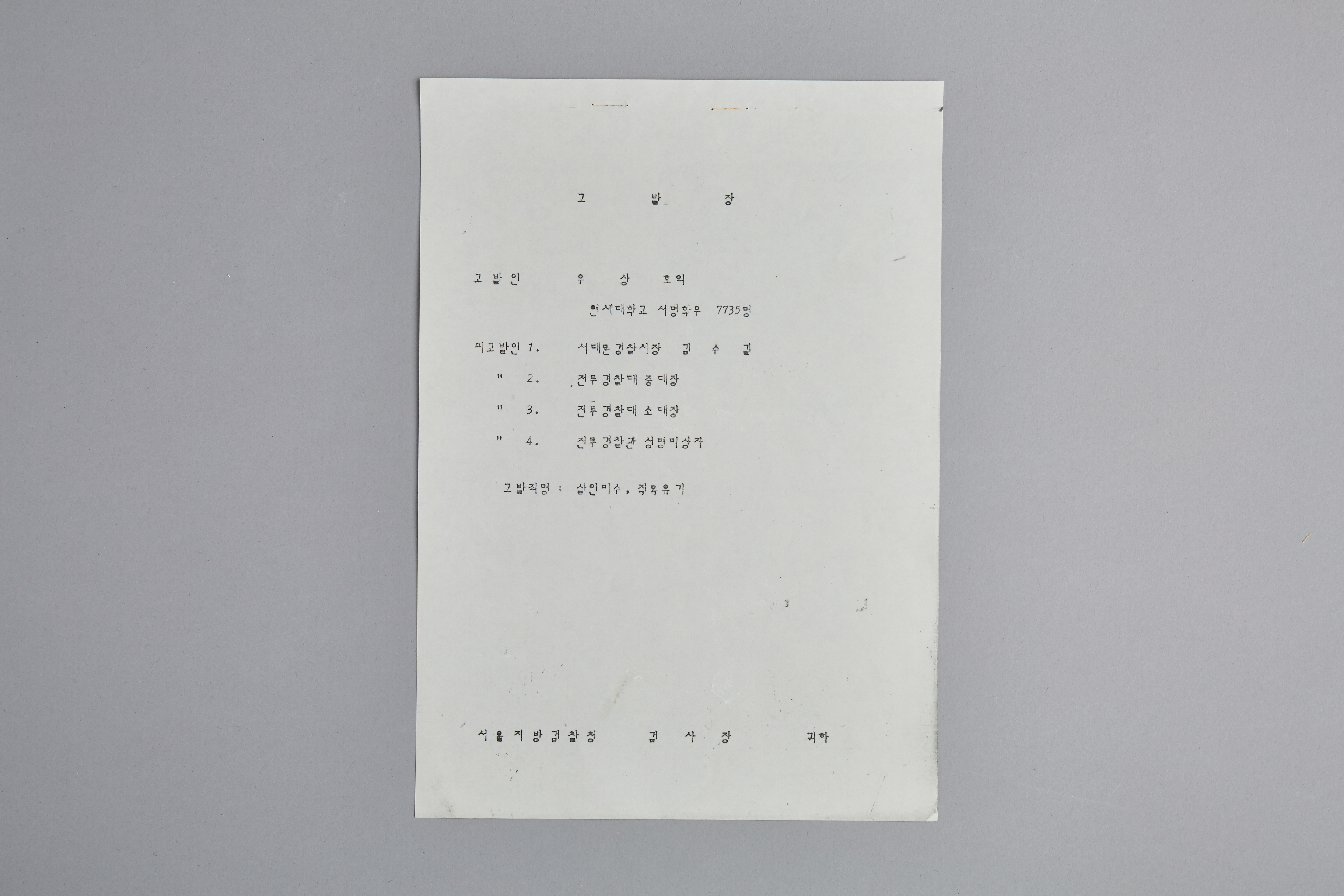 경찰의 최루탄 피격을 고발하는 검찰청에 제출된 고발장입니다. 고발자는 우상호 총학생호장 외 연세대학교 학우 7735명이고 피고발자는 서대문 경찰서장과 전투경찰입니다. 연세대학교 학생들이 고발한 이한열 최루탄 피격사건은 '직격 최루탄을 쏜 사람을 적시할 수 없다.'는 이유로 기각됩니다. 당시 시위를 진압했던 한 전투경찰의 증언에 따르면 검찰은 조사받으러 온 그에게 돌려보냈다고 합니다.