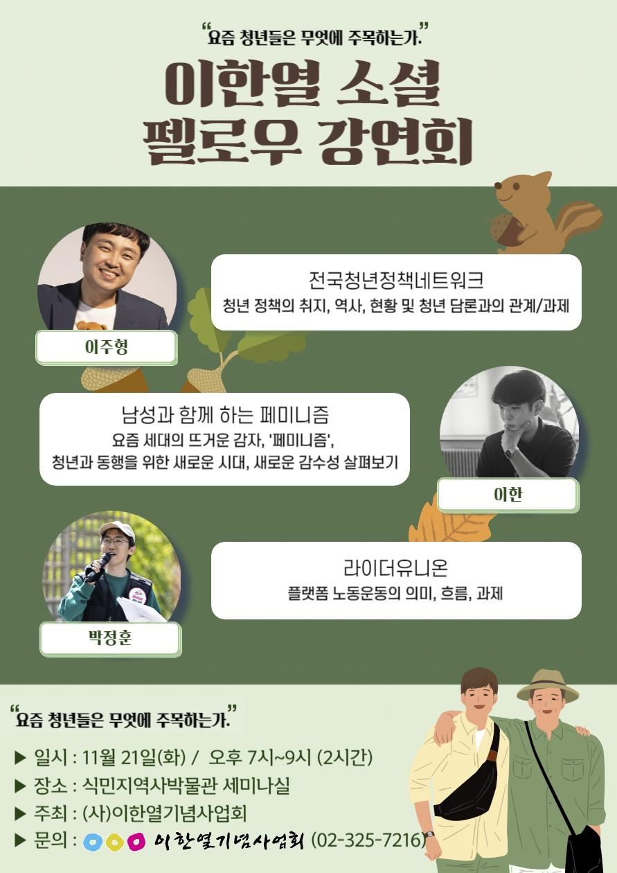11월 21일(화) 오후 7시, 식민지역사박물관 세미나실에서 '이한열소셜펠로우 강연회' 진행합니다. 바로 오늘 우리 사회를 지탱하는 활동, 미래를 향한 운동을 고민하고 있는 청년활동가들의 이야기를 함께 들어보시죠. 회원여러분의 많은 참여 바랍니다. |
