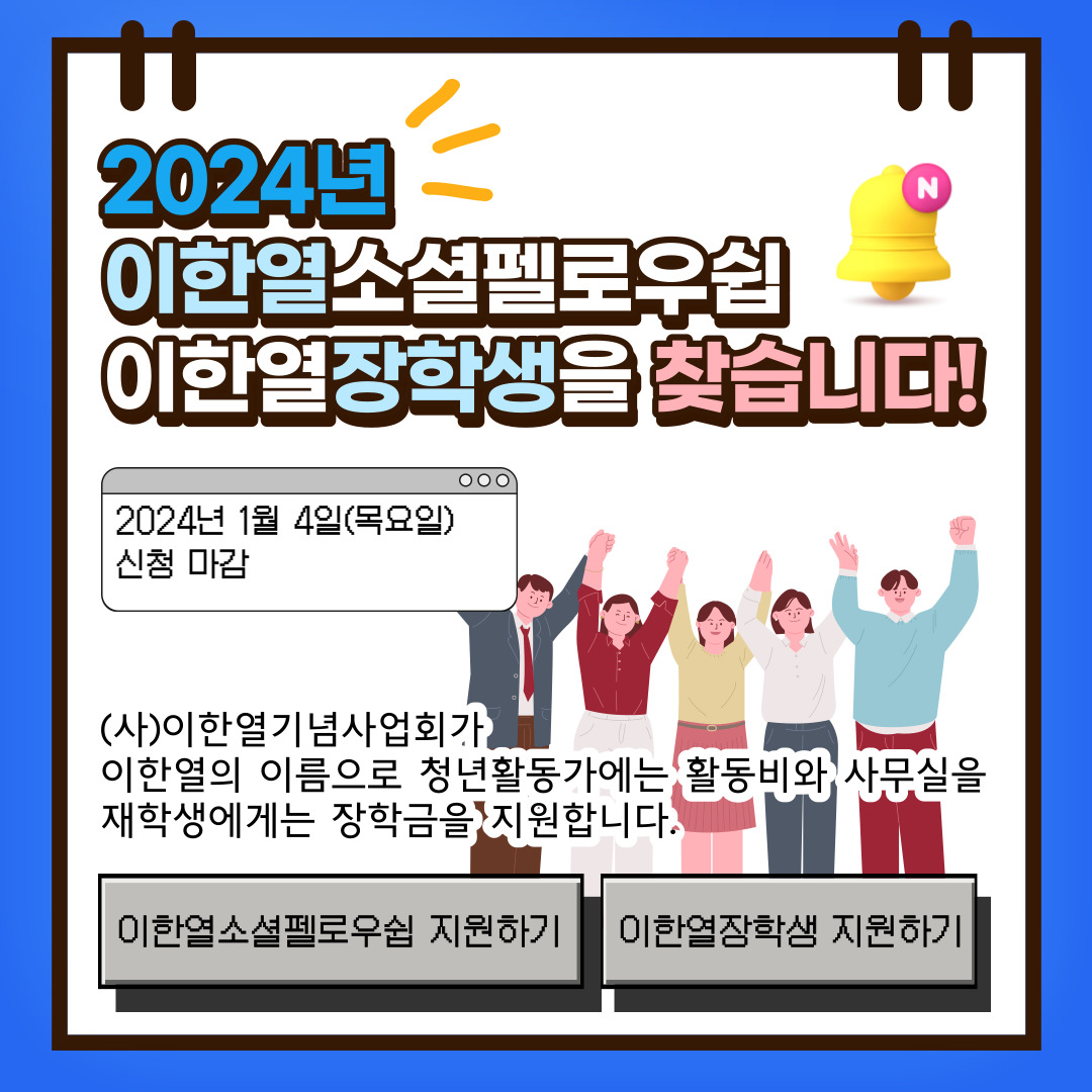 2024년 이한열소셜펠로우와 이한열장학생을 찾습니다. 우리 사업회는 청년 이한열이 기억되기를 바라는 마음으로 이한열장학금을 운영해왔습니다. 2023년 청년활동가를 지원하는 '이한열소셜펠로우쉽'사업을 도입하고 활동가들에게 활동비와 기념관 1층 공유사무실을 지원하고 있습니다. (사)이한열기념사업회는 이 시대의 민주주의의 진전을 위해 노력하는 청년들에게 든든한 지원자가 되어주고 싶습니다. 2024년 이한열소셜펠로우쉽, 이한열 장학생 신청안내는 이한열기념사업회 홈페이지 를 통해 보실 수 있습니다. 2023년에 함께 했던 이한열소셜펠로우 1기들의 활동내용도 보실 수 있으니 많이 방문해 주세요. 지원이 필요한 청년활동가와 학생들에게 소식 전해주시면 감사하겠습니다. 이한열소셜펠로우쉽과 이한열장학금은 회원들의 회비로 운영하고 있습니다. 2024년에도 많은 관심 부탁드립니다.