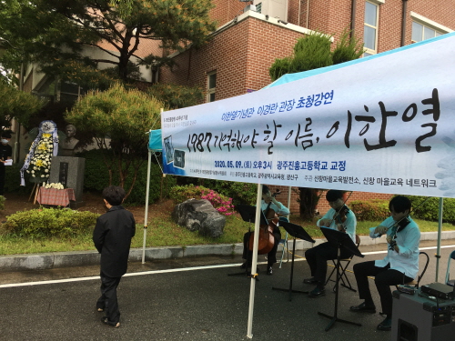 진흥고 정문을 들어서자마자 오른쪽에 이한열의 흉상이 있습니다. 그 앞에서 SWA 오케스트라단의 연주에 맞춰 초등 3학년 학생의 추모 노래로 행사가 시작되었습니다.