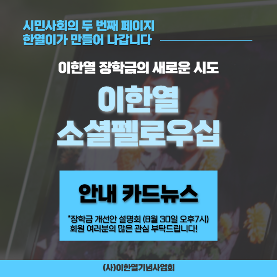 안녕하세요. 오랜만에 소식 전합니다. 2008년부터 시작했던 이한열장학회가 두 번째 페이지를 만들어 보려고 합니다. 8월 30일 오후 7시 이한열기념관에서, 이한열장학생 수여식과 함께 이한열펠로우십 설명회를 진행하려고 합니다. 많은 분들의 참여를 기대합니다. 아래 링크를 통해, 참가신청 해주세요.
