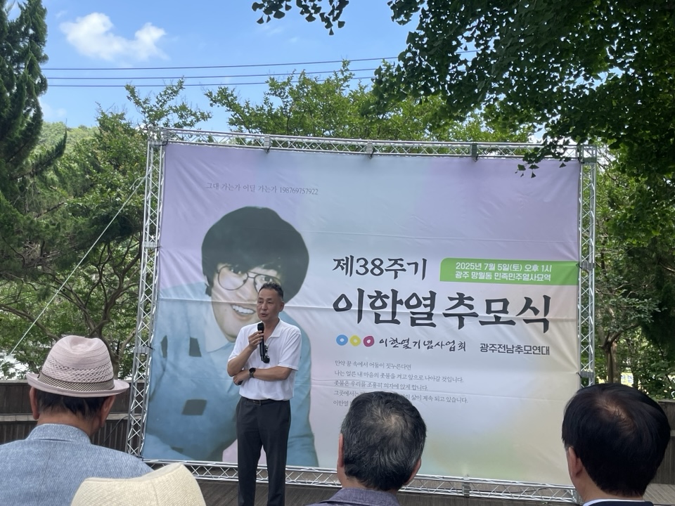 제38주기 이한열추모식 진행했습니다. 지난 7월 5일(토) 광주망월묘역에서 제38주기 이한열추모식을 우리사업회 회원, 연세민주동문회 동문 여러분, 연세대학교 이한열학생추모기획단원, 광주지역 시민단체 활동가와 시민, 이한열의 가족들이 참여한 가운데 진행했습니다. 무더위에도 불구하고 많은 분들이 찾아주셨습니다. 감사합니다. 특히 이한열의 모교인 광주 동산초등학교, 광주진흥고등학교의 재학생들과 연세대학교 학생추모기획단원들이 함께 해 주셔서 더욱 감사했습니다. 청년 이한열이 미래세대들에게도 기억되기를 바라는 마음이 잘 전해지고 있는 것 같습니다. 올해는 무더위로 인해, 민족민주열사 봉안소 옆 솔밭에서 추모식을 진행하고, 이한열의 묘역에서 헌화를 진행했습니다. 우원식 국회의장, 우상호 정무수석, 민주화운동기념사업회, 박종철기념사업회를 비롯해 많은 분들이 화환보내주셨습니다. 감사합니다. 서울에서 참가한 분들은 배은심 어머니 묘소에 들러 참배를 하고, 추모식에 참여했습니다. 광주망월묘역에서 진행하는 이한열추모식은, 우리사업회와 광주전남추모연대가 함께 준비합니다. 무더위에 행사를 준비해주시는 광주지역 활동가여러분께 깊이 감사드립니다.