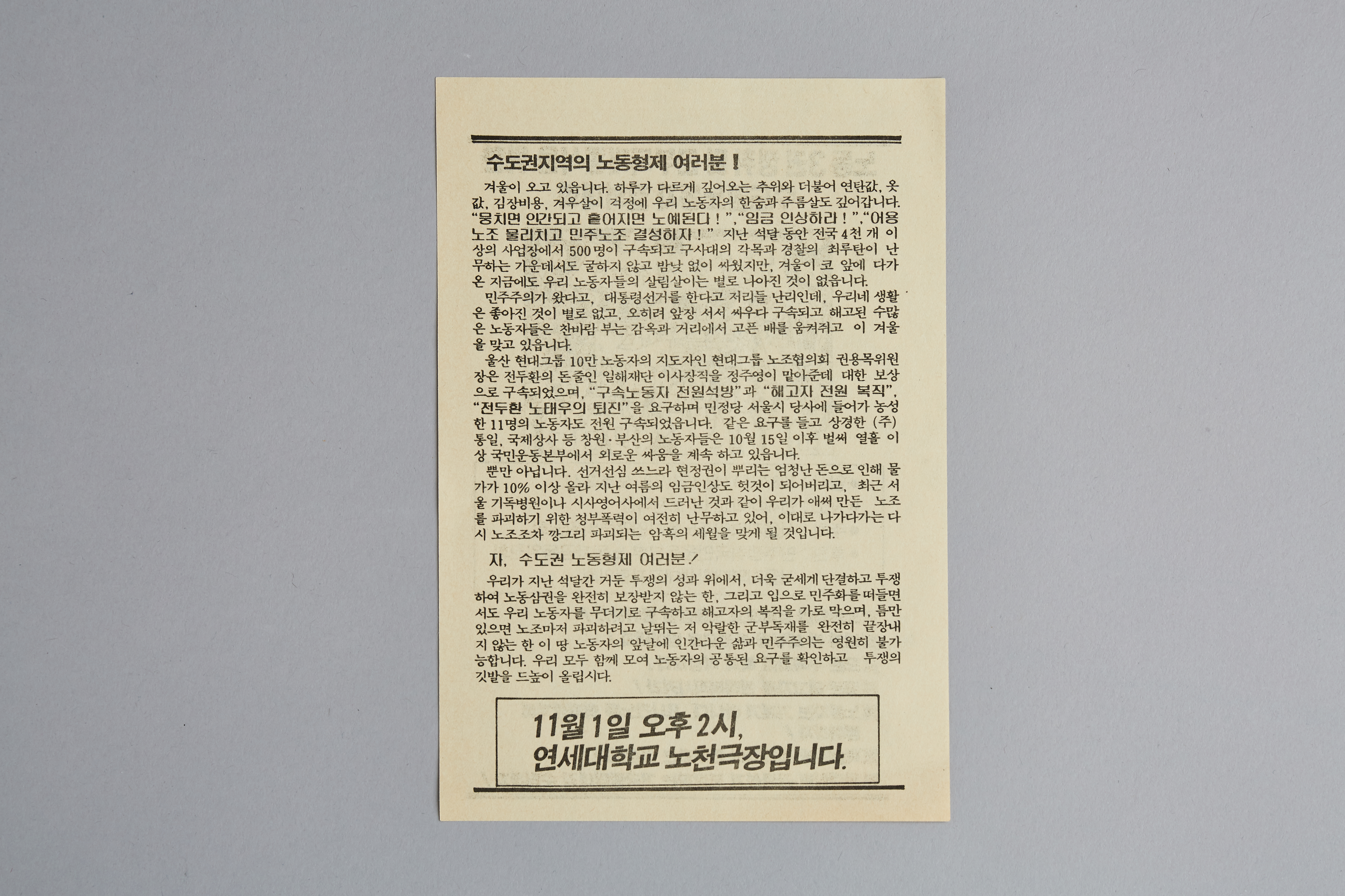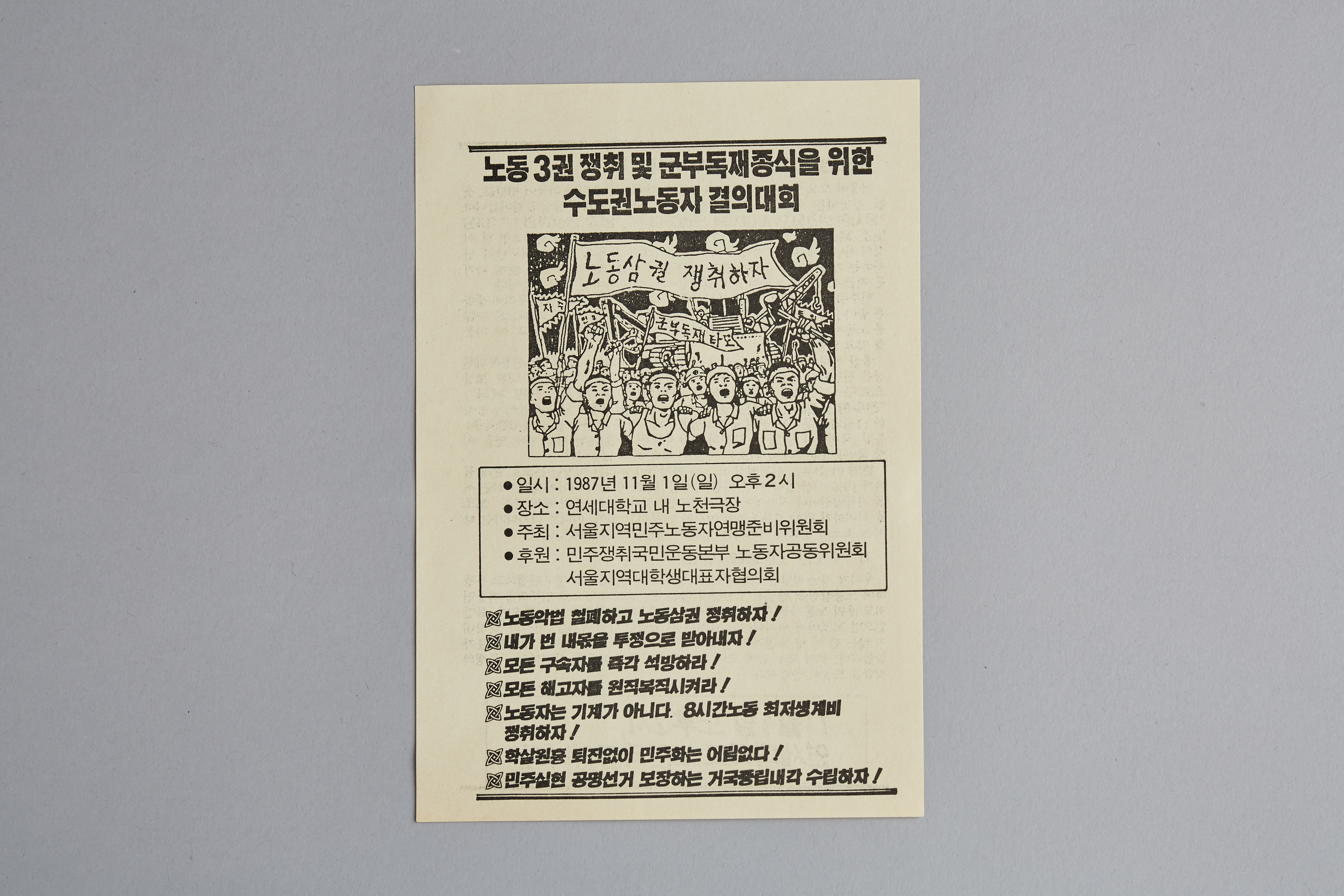 11월 1일에 열릴 수도권노동자 결의대회안내를 홍보하는 전단지이다. 6월항쟁과 노동자대투쟁의 성과를 이어가면서 노동3권 쟁취, 해고자 복직, 노동시간 준수 등을 요구하는 집회이다.