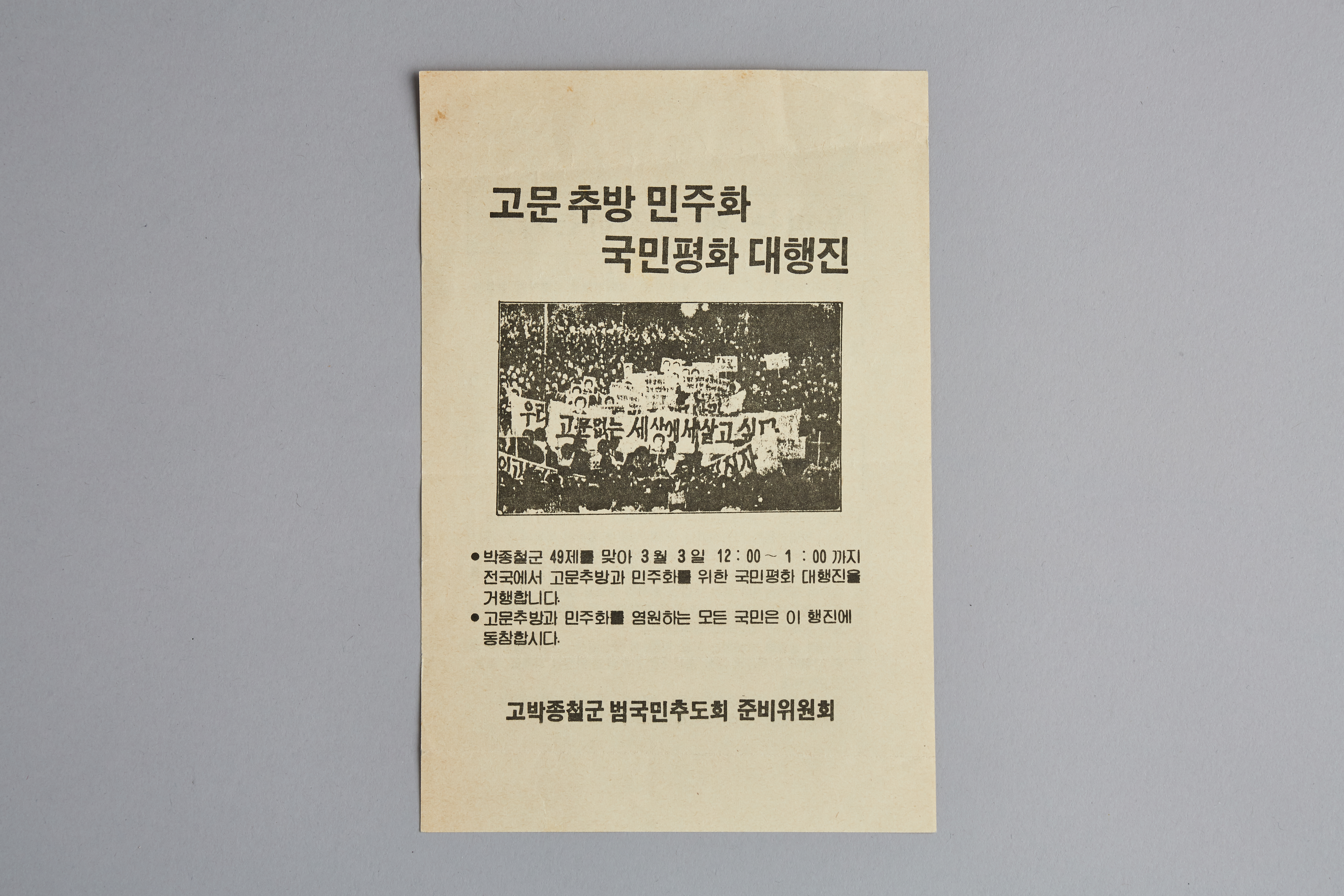 1987년 3월 3일(박종철의 49재)에 열릴 '고문추방 민주화국민평화대행진' 전단지이다. 평화대행진은 박종철 등 고문희생자들에 대한 추모와 불법연금, 강제연행, 고문용공조작 사건의 진상규명과 책임자 처벌요구 등에 있다고 밝혔지만 경찰은 행사 장소들을 봉쇄하고 폭력적으로 해산작전을 펼쳤다.
