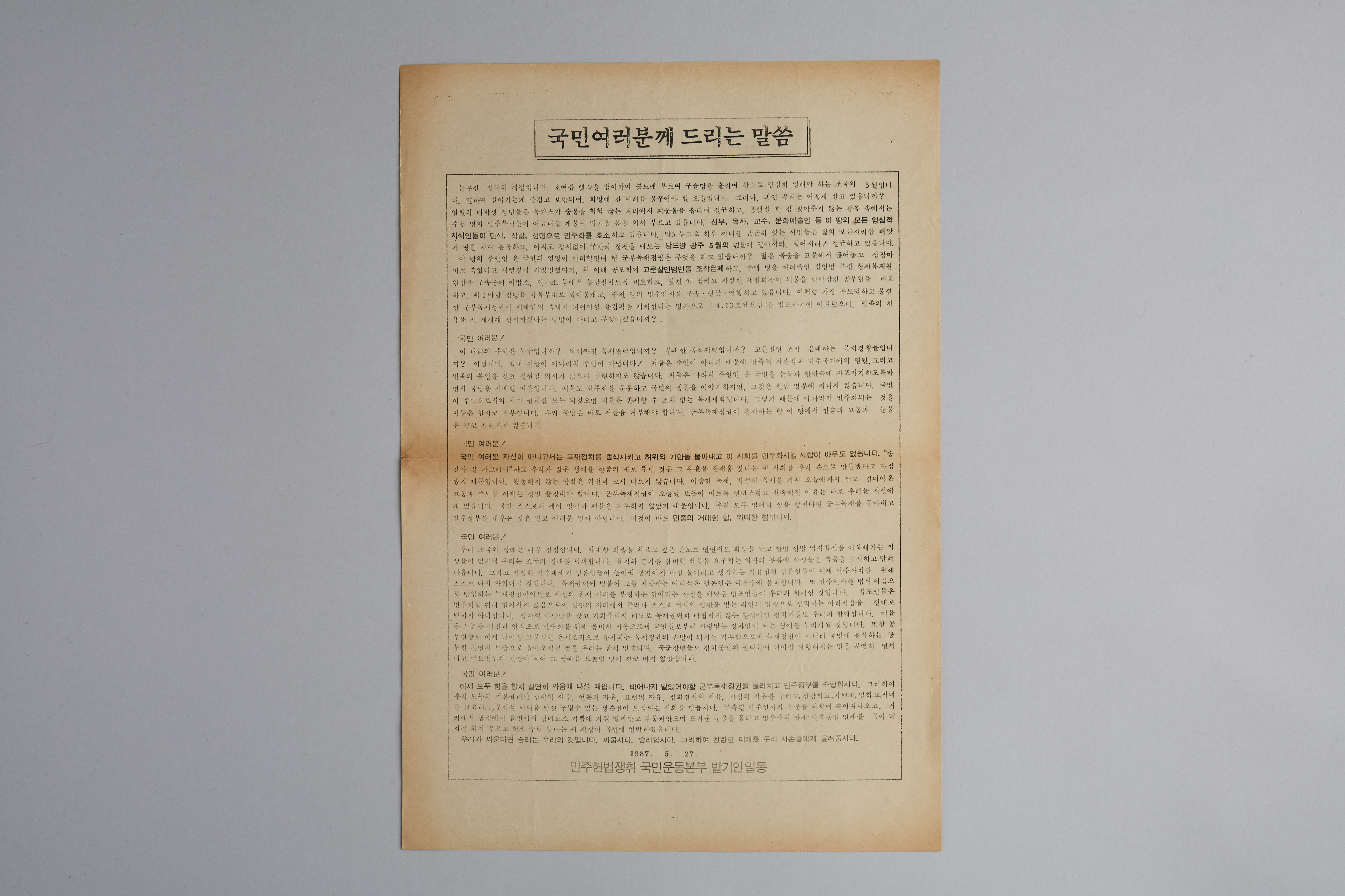 1987년 5월 27일, 전두환정권의 4.13 호헌조치 철회와 대통령 직선제로의 개헌을 위해 야당 정치인과 시민단체, 학생운동권, 종교계 인사들이 모여 민주헌법쟁취국민운동본부(국본)가 결성됩니다. 건국 이후 최대 규모의 반독재 연합전선을 구축함으로써 6월항쟁을 주도적으로 이끌었으며 민주화세력을 결집시켜 정치적 구심체 역할을 하였습니다. 국본은 민정당 대통령 후보를 정하는 6월 10일 ‘고문살인 은폐 규탄 및 호헌철폐 국민대회’를 열기로 하고 '6.10국민대회 행동요강'을 발표하는 등 준비에 만전을 기했습니다.