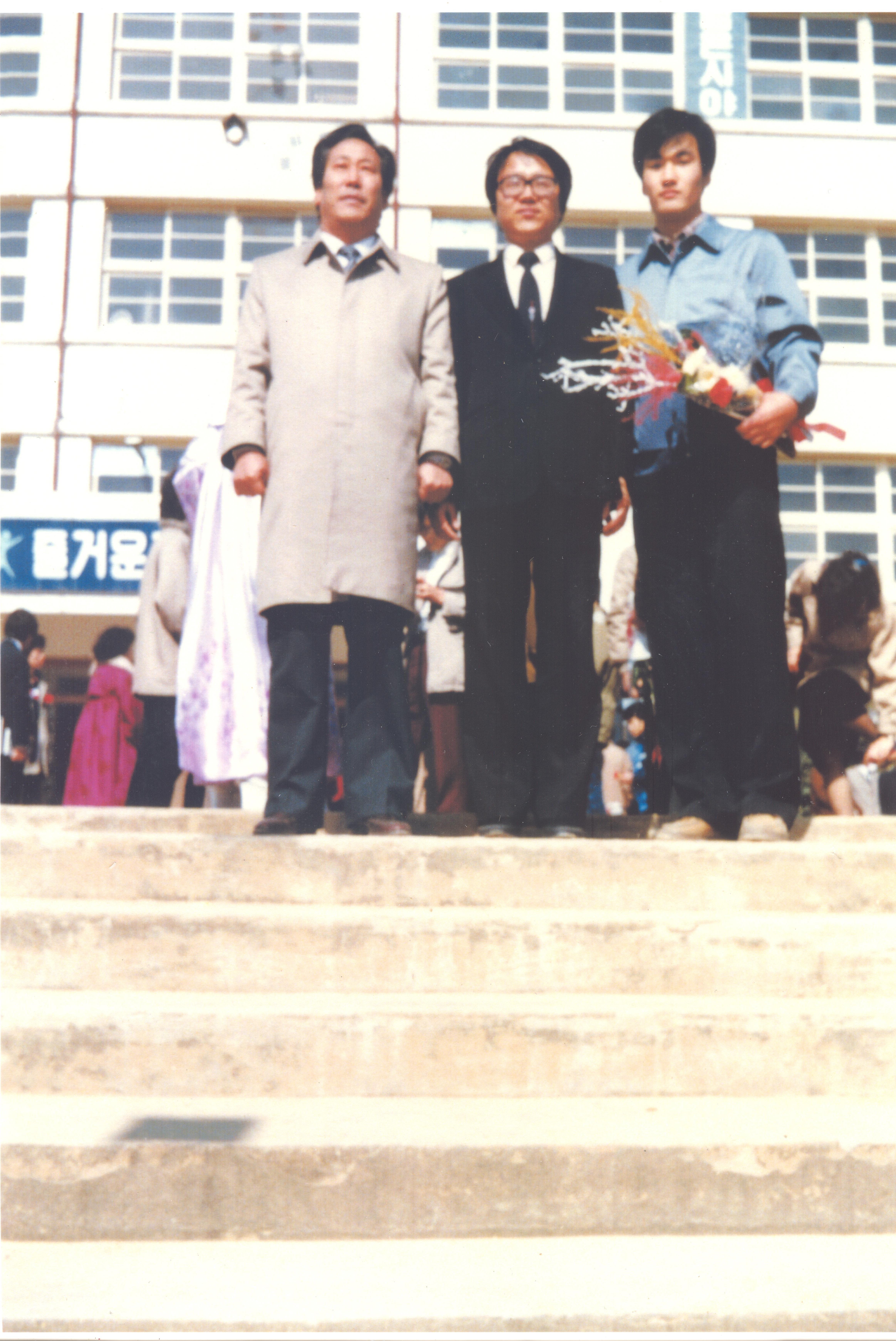 1985년 2월 진흥고 졸업식에서 아버님, 담임 교사와 함께한 이한열