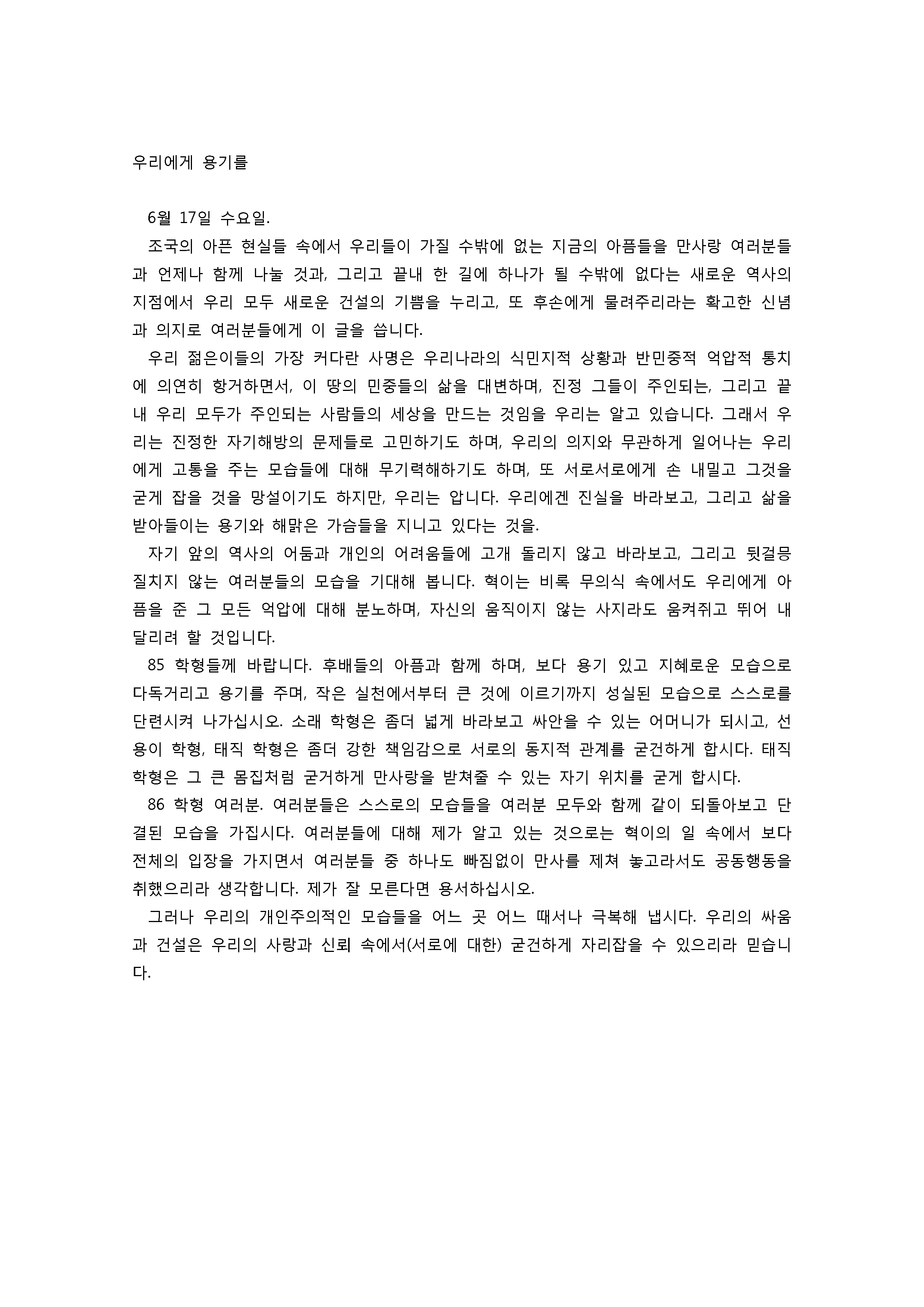 이 작은 책자를 높이 들어 삼가 열사의 명복을 다시 빌며, 조국의 민주와 자유, 그리고 자주와 통일 염원하여 싸우는 모든 분들께 이 책을 바칩니다.